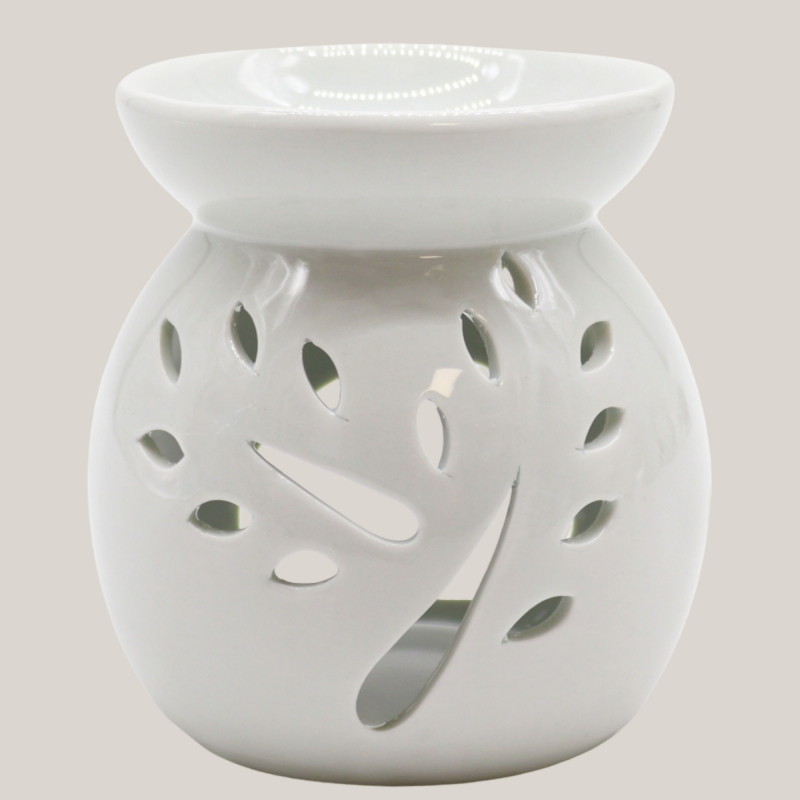 Weiße Duftlampe mit Blatt-Motiv, 9,5 cm hoch. Ideal für Duftöl & Wachs. Klassisch, dekorativ & als Geschenk für jedes Zuhause geeignet.