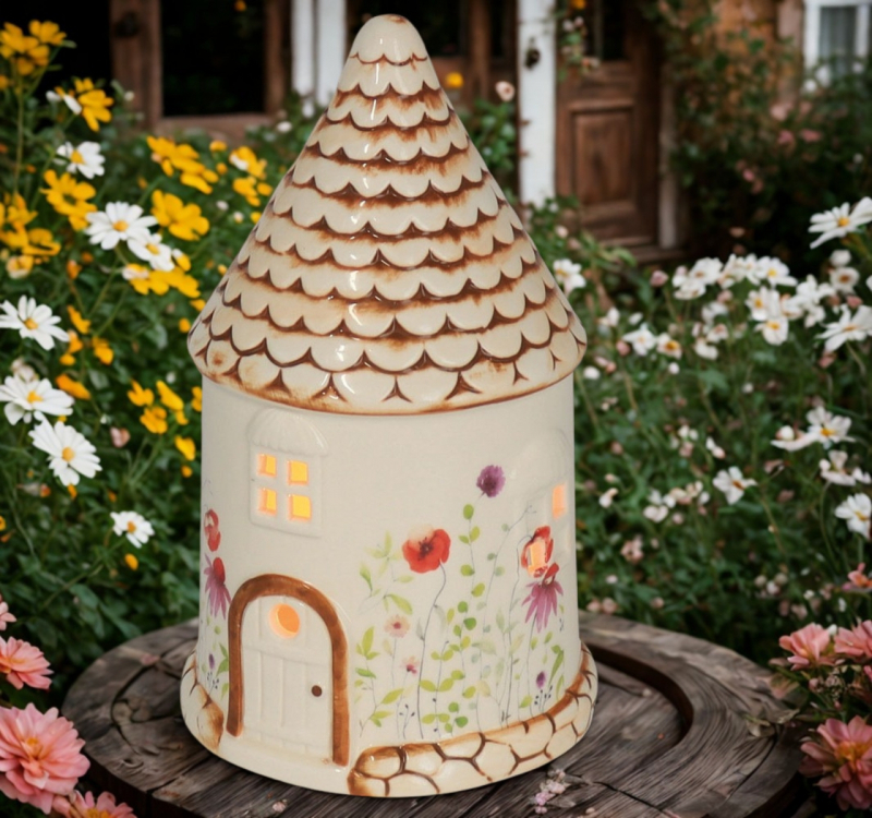 Mit seinen filigranen Blumenmotiven und dem detailreichen Dach erinnert das Häuschen an idyllische Landhäuser und bringt einen Hauch von Romantik und Natur in deine Dekoration.