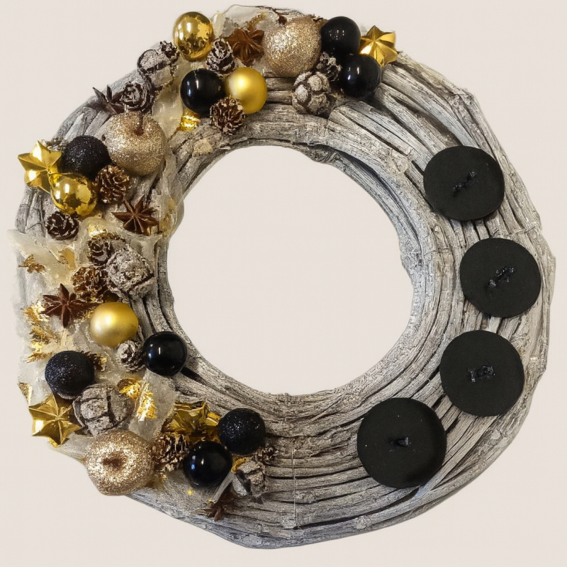 Dieser flache Adventskranz aus Holz überzeugt mit seiner edlen Schwarz-Gold-Optik und einem modernen, natürlichen Look. Mit einem Durchmesser von 40 cm ist er ein stilvoller Hingucker auf Tisch, Sideboard oder Fensterbank.