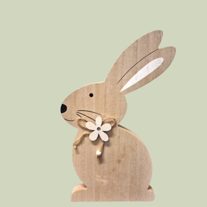 Holzhase zum Aufstellen in Braun mit Blümchen am Hals. Die Dekofigur ist 26,5 cm groß und bringt natürliche Osterstimmung ins Zuhause.