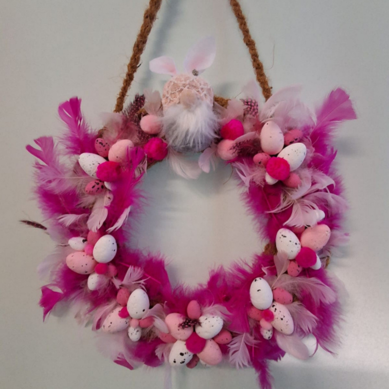Osterkranz Crazy Pink: Handgefertigter 34 cm Türkranz in Rosa, Pink & Weiß. Dekoeier, Federn & pinker Hase – einzigartiges Oster-Unikat.