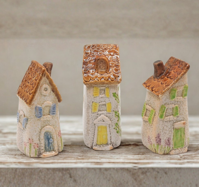 Diese charmanten Dekohäuser aus Keramik verzaubern mit ihrem liebevollen Design und ihren sanften Farben. Die Kombination aus floralen Details und den harmonischen Farbtönen Grün, Gelb und Blau erinnert an kleine, idyllische Häuser inmitten eines blühenden Gartens.