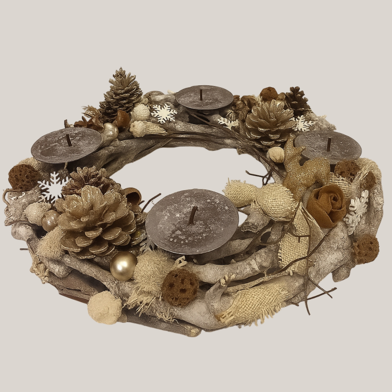 Dieser aufwendig handgefertigte Adventskranz ist ein exklusives Schmuckstück für Ihre weihnachtliche Dekoration. Mit einem Durchmesser von 40 cm bietet er die perfekte Größe für Tisch, Kommode oder Fensterbank – und zieht mit seinem festlichen Glanz garantiert alle Blicke auf sich.