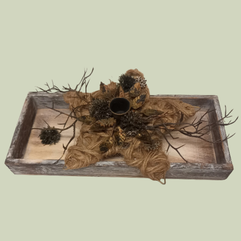 Festlich dekoriertes Tablett mit Stern und Stabkerzenhalter, verziert mit Naturmaterialien und Juteband – perfekt für deine weihnachtliche Tischdeko.