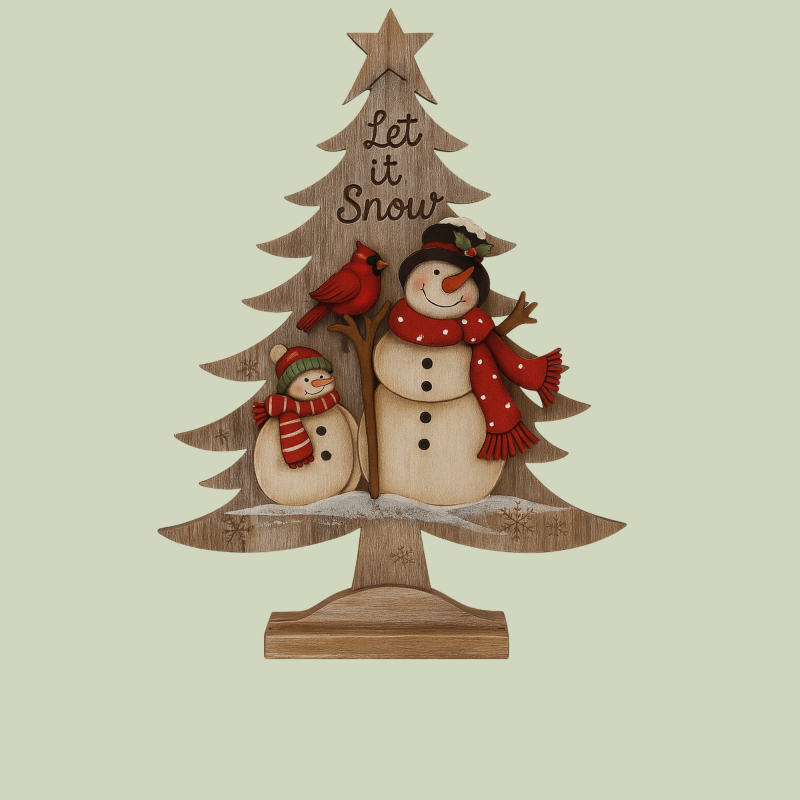 Dekobaum aus Holz von Seyko, 38 cm hoch – mit Schneemann-Familie verziert. Perfekt als festliche Dekoration für ein gemütliches Zuhause zu Weihnachten.