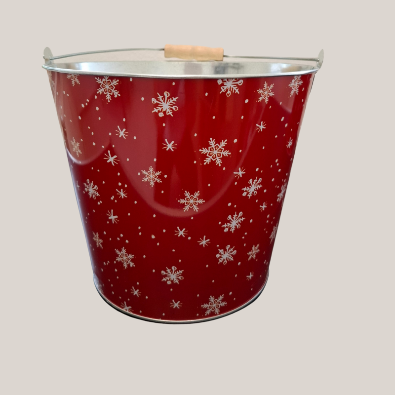 Großer Metalleimer in Rot mit Schneeflocken, Henkel & Holzgriff – perfekt als Weihnachtsdeko, Geschenkverpackung oder zum Bepflanzen.