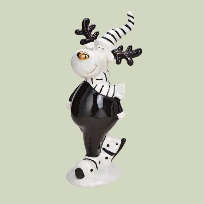 Dieser moderne Deko-Hirsch aus Keramik begeistert mit stilvoller Eleganz und winterlichem Charakter.Das schwarz-weiße Design mit liebevoll modellierten Schlittschuhen macht ihn zum besonderen Blickfang in jeder Winter- und Weihnachtsdekoration.