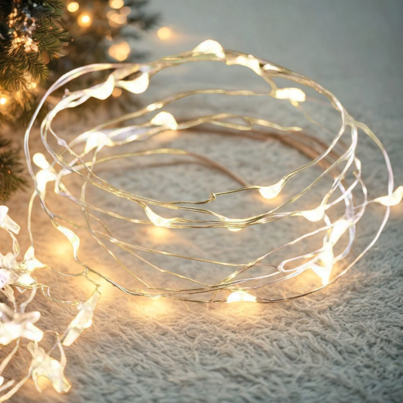 Die zarte Drahtkonstruktion macht die Lichterkette besonders flexibel – perfekt zum Dekorieren von Kränzen, Gläsern, Tischdekos oder floralen Arrangements. Der Betrieb erfolgt über eine integrierte Knopfzellenbatterie (bereits enthalten), sodass du sie überall einsetzen kannst – ganz ohne Steckdose.