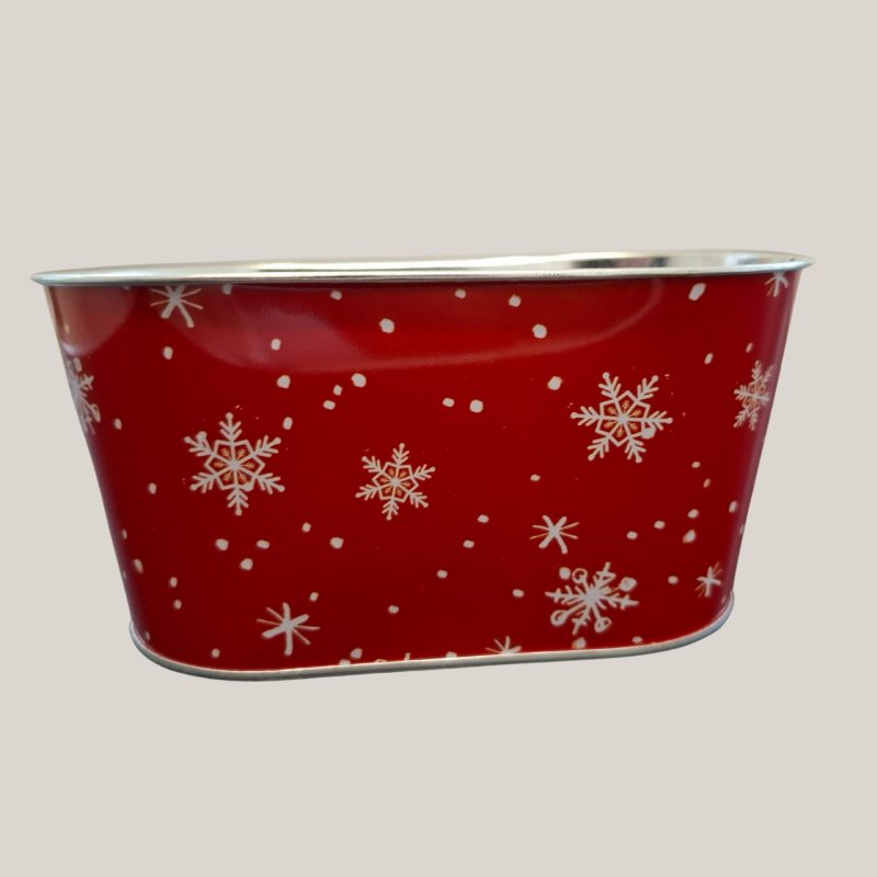 Ovale Schale aus Metall in Rot mit weißen Schneeflocken – ideal für Winterpflanzen, Deko oder als originelle Geschenkverpackung.