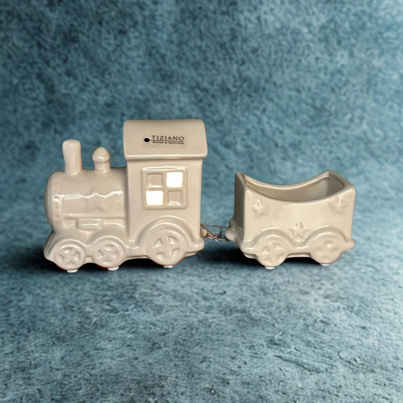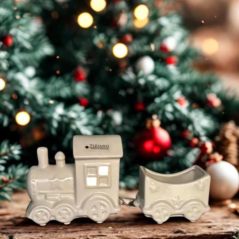 Zweiteiliger Deko-Zug in Cremeweiß mit LED & Timerfunktion – liebevoll gestaltet, 22,5 cm lang. Ideal für winterliche und nostalgische Weihnachtsdekoration.