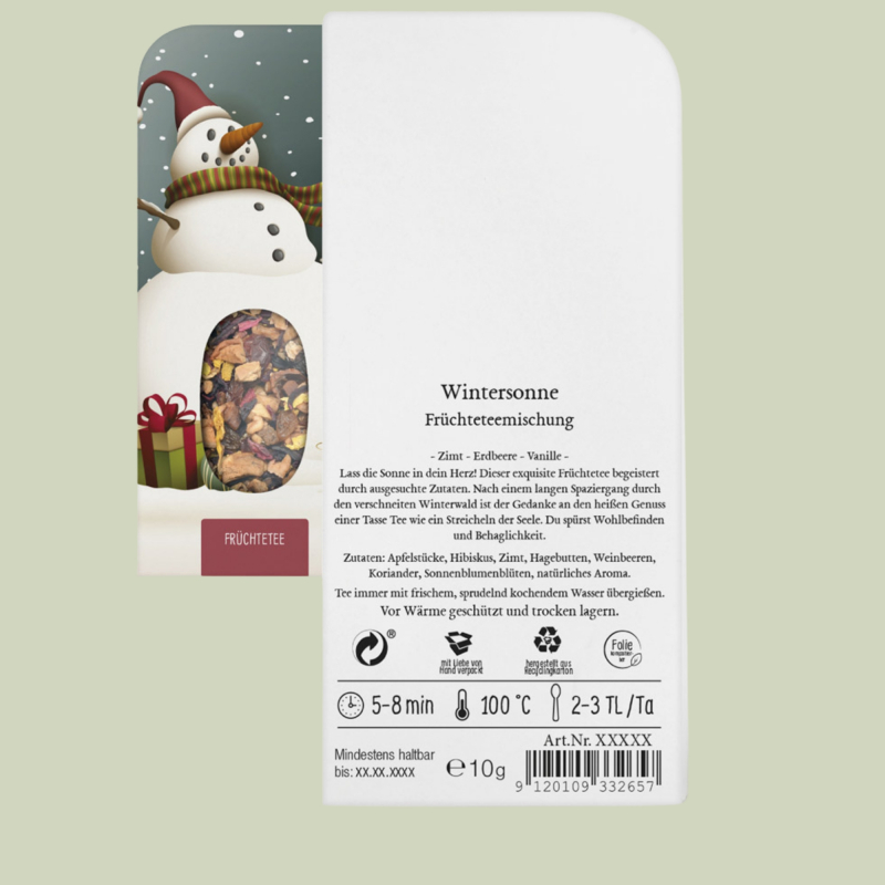 Diese winterlich gestaltete Genusskarte mit liebevollem Schneemann-Motiv ist das perfekte kleine Geschenk in der Advents- und Weihnachtszeit.Im Inneren befindet sich 10 g Früchtetee „Wintersonne“ – eine fein abgestimmte Teemischung mit Zimt, Erdbeere und Vanille, die nach einem Spaziergang durch den Winterwald wohltuend wärmt.