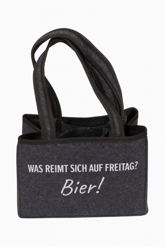 Diese Flaschentasche aus Filz bietet Platz für 6 Flaschen und überzeugt mit dem humorvollen Spruch "Was reimt sich auf Freitag? Bier!".Mit einer Größe von ca. 24 cm x 15 cm ist sie die ideale Geschenkidee für Bierliebhaber und perfekt für den Transport oder als originelle Verpackung. Eine lustige und praktische Lösung für Biergeschenke bei jeder Gelegenheit.
